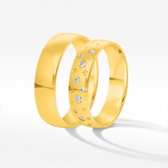Oferujemy zachwycające obrączki z żółtego złota, które połączą Was na zawsze. W tym komplecie energia kobieca i męska przeplatają się w idealnej harmonii. Zestaw obrączek symbolizuje szczęśliwy i dobrze dobrany związek, w którym króluje równowaga. Żółte złoto swoim ciepłym blaskiem rozjaśni Wasze wspólne dni.