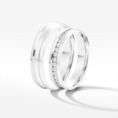 Prezentowany tu wariant złotych krążków to idealny wybór na ceremonię marzeń. Jeśli pragniesz, aby połączyła Was biżuteryjna doskonałość, to zdecydowanie model dla Ciebie. Harmonijna kompozycja wariantu dla Niej i dla Niego jest metaforą dwóch części, tworzących perfekcyjną całość. Białe złoto to piękno, która trwa mimo zmieniających się trendów.