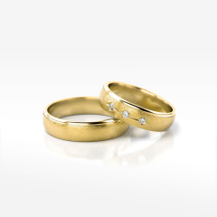 Wiele par szuka efektownych obrączek, które będą eleganckie, a jednocześnie nietuzinkowe. W naszej ofercie znalazły się modele diamentowane i frezowane. Zachwycają swoją ponacinaną strukturą zewnętrzną, tworzącą nieregularne, efektowne żłobienia w złocie, które w połączeniu z polerowaną obwódką i wewnętrzną strukturą doskonale się prezentują. Obrączka damska dodatkowo ozdobiona jest kryształkami, co sprawia, że jest jeszcze bardziej dekoracyjna. To doskonały wybór do pierścionka zaręczynowego z dużym diamentem, wszak te dwa elementy ślubnej biżuterii powinny się ze sobą komponować. Klasyczne, złote obrączki ślubne w wydaniu glamour to idealny dodatek zarówno do minimalistycznych, jak i strojnych ślubnych stylizacji. Na uwagę zasługuje fakt, że są szerokie, dlatego mogą Państwo wybrać elegancki grawer, który będzie wyraźnie widoczny na wewnętrznej, gładkiej stronie. Jest to usługa wliczona w cenę, zatem nie trzeba ponosić dodatkowych kosztów.