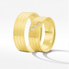 Prezentujemy szerokie obrączki ślubne wykonane według najgorętszych trendów biżuteryjnego wzornictwa. Wytrawni mistrzowie projektowania przemienili klasyczny symbol miłości w nietuzinkową ozdobę. Najpopularniejszy pośród Nowożeńców kruszec, w tej odsłonie wymyka się wszelkim schematom. Poddany specjalnemu zabiegowi piaskowania, stał się wytwornie matowy. Oba złote krążki zachwycają, jednak model dla Niego pozostaje męski i zdecydowany, natomiast biżuteria ślubna dla Niej to czysta poezja. Trzy lśniące diamenty (lub cyrkonie) zanurzone w ciepłym blasku żółtego złota prezentują się oryginalnie i zachwycająco. Taka szeroka obrączka stworzy piękny duet z pierścionkiem zaręczynowym.