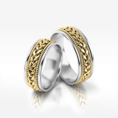 Oferujemy oryginalne obrączki z białego i żółtego złota. Dwukolorowe krążki ślubne łączą w sobie różne odmiany kruszcu, z których każda symbolizuje inną energię – męską lub żeńską. Taniec tych dwóch jakości uchwycony został we wzorze o ponadczasowym pięknie. Propozycja dla idealnie dobranych par.