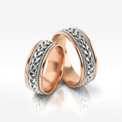 Prezentujemy efektowne obrączki ślubne wykonane z różowego i białego złota. Ta nietypowa propozycja z pewnością przypadnie do gustu parom, które lubią otaczać się tym, co wyjątkowe. Takie właśnie jest wzornictwo tej biżuterii. Dwukolorowe krążki łączą klasykę z nowoczesnością i robią to w pięknym stylu.