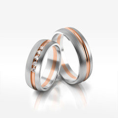 Prezentujemy efektowne obrączki ślubne wykonane z różowego i białego złota. Ta nietypowa propozycja z pewnością przypadnie do gustu parom, które lubią otaczać się tym, co wyjątkowe. Takie właśnie jest wzornictwo tej biżuterii. Dwukolorowe krążki łączą klasykę z nowoczesnością i robią to w pięknym stylu.