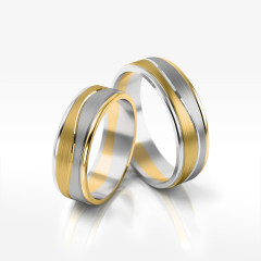 Oferujemy oryginalne obrączki z białego i żółtego złota. Dwukolorowe krążki ślubne łączą w sobie różne odmiany kruszcu, z których każda symbolizuje inną energię – męską lub żeńską. Taniec tych dwóch jakości uchwycony został we wzorze o ponadczasowym pięknie. Propozycja dla idealnie dobranych par.