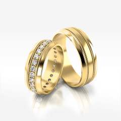 Prezentujemy komplet nietuzinkowych szerokich obrączek ślubnych wykonanych z żółtego złota najwyższej jakości. Szlachetny kruszec lśni i emanuje charakterystycznym dla siebie ciepłem. To nie tylko kwintesencja elegancji, ale także piękna metafora miłości. Nieco bardziej szerokie niż klasyczne, złote krążki zachwycają zdobieniami. Produkty tworzą spójną kompozycję, która symbolizuje silną małżeńską więź. Obrączka dla Niego jest męska i wyrazista, a dzięki dyskretnym wzorom, zyskuje unikalny charakter. Biżuteria ślubna dla Niej skąpana jest w blasku diamentów (lub cyrkonii – swoją opcję wybierzesz w menu obok zdjęcia). To propozycja idealna dla kobiet, które kochają bogate i nietuzinkowe ozdoby.