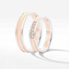 Prezentowane tu dwukolorowe obrączki ślubne to elegancki sposób na przypieczętowanie wspólnej przyszłości. Z białego i różowego złota powstają krążki, które podkreślają wyjątkowość relacji. Jeśli szukacie detalu, który pozwoli Wam wyłamać się ze schematu i wyróżnić – to zdecydowanie propozycja dla Was.