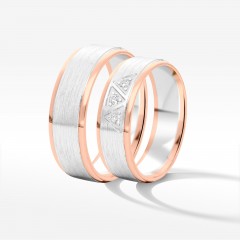 Prezentowane tu dwukolorowe obrączki ślubne to elegancki sposób na przypieczętowanie wspólnej przyszłości. Z białego i różowego złota powstają krążki, które podkreślają wyjątkowość relacji. Jeśli szukacie detalu, który pozwoli Wam wyłamać się ze schematu i wyróżnić – to zdecydowanie propozycja dla Was.