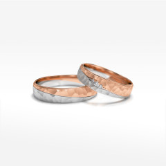 Prezentowane tu dwukolorowe obrączki ślubne to elegancki sposób na przypieczętowanie wspólnej przyszłości. Z białego i różowego złota powstają krążki, które podkreślają wyjątkowość relacji. Jeśli szukacie detalu, który pozwoli Wam wyłamać się ze schematu i wyróżnić – to zdecydowanie propozycja dla Was.