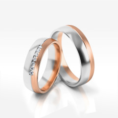 Prezentowane tu dwukolorowe obrączki ślubne to elegancki sposób na przypieczętowanie wspólnej przyszłości. Z białego i różowego złota powstają krążki, które podkreślają wyjątkowość relacji. Jeśli szukacie detalu, który pozwoli Wam wyłamać się ze schematu i wyróżnić – to zdecydowanie propozycja dla Was.