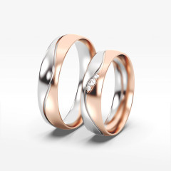 Prezentujemy efektowne obrączki ślubne wykonane z różowego i białego złota. Ta nietypowa propozycja z pewnością przypadnie do gustu parom, które lubią otaczać się tym, co wyjątkowe. Takie właśnie jest wzornictwo tej biżuterii. Dwukolorowe krążki łączą klasykę z nowoczesnością i robią to w pięknym stylu.
